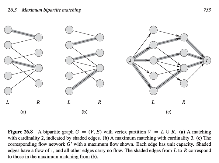 . We then add edges between vertices in the source set and adjacent vertices in the target set. Once we solve for the max network flow, we can recover the bipartite matching that results in the max network flow.